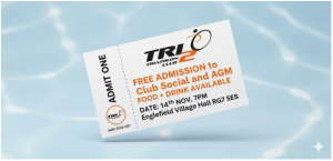 The upcoming AGM to be held on FRIDAY 14nd November, I encourage you to put the date in your diary & join your fellow members of TRI2O for the meeting and for the opportunity to socialise afterwards over a free buffet of healthy & tasty delights!